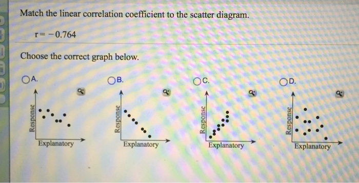 D r 0946. Match the linear correlation coefficient to the scatter diagram. Ar -0049 b r -0969 c r -1 Response a Scatter diagram Explanatory b Scatter diagram c Scatter diagram Response Explanatory Explanatory Questio Wely Match the linear correlation coefficient to the scatter.